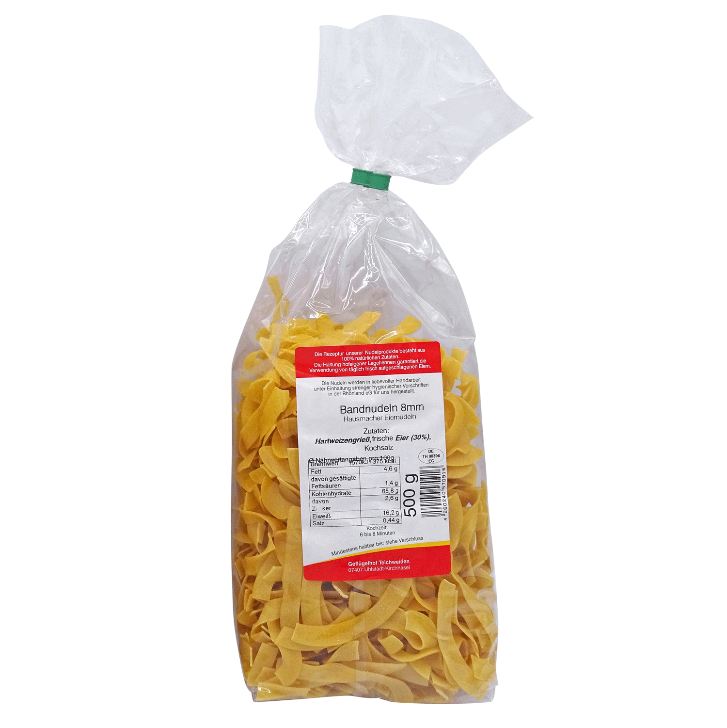 Bandnudeln - Teichweidener hausgemachte Eiernudeln: die Rezeptur unserer Nudelprodukte besteht aus 100% natürlichen Zutaten. Die Haltung hofeigener Legehennen garantiert die Verwendung von täglich frisch aufgeschlagenen Eiern. Die Nudeln werden in liebevoller Handarbeit unter Einhaltung strenger hygienischer Vorschriften hergestellt. Kochzeit: 6 bis 8 Minuten