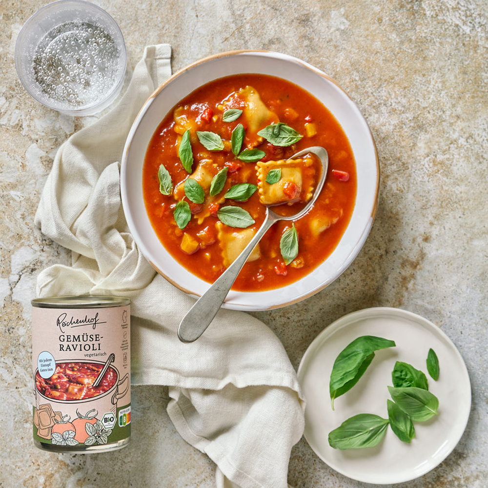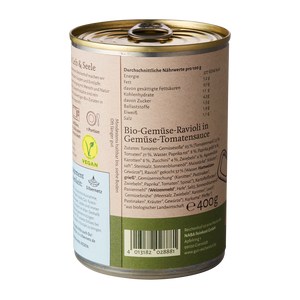 Ravioli in fruchtiger Gemüse-Tomatensauce, die mit leckerem Bio Gemüse wie Karotten, Mais, Erbsen, Tomaten und grüner Paprika verfeinert ist.