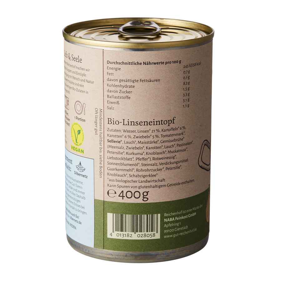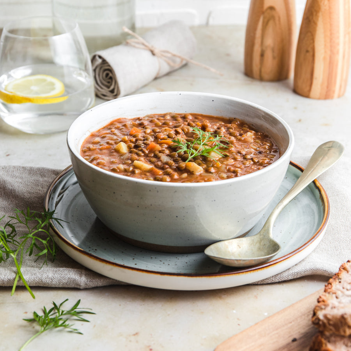 Der beliebte Klassiker unter den Eintöpfen - gespickt mit Kartoffeln, Karotten und Sellerie sind die Linsen noch verfeinert mit Kurkuma, Knoblauch und Muskatnuss.