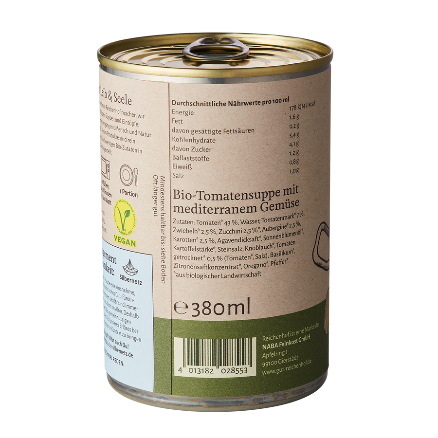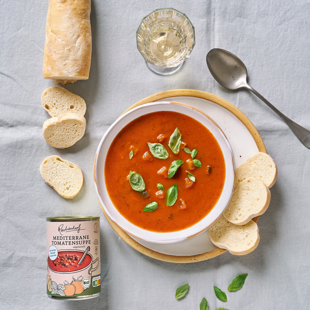 Unsere Tomatensuppe mit besonders aromatischen Tomaten und mediterranem Gemüse bringt dich auf eine Genussreise in den Süden.