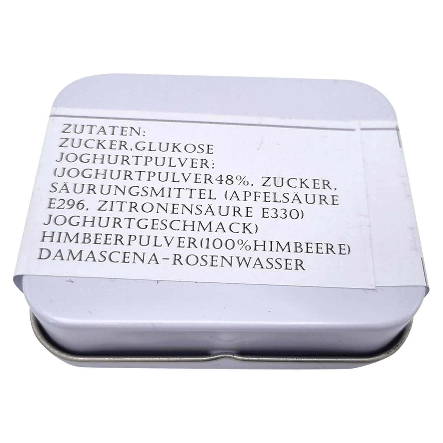 Zucker, Glucosesirup, Himbeerfruchtpulver 50%, Joghurtpulver 48%, Säureregulator Zitronensäure E330, Apfelsäure E296, Rosenwasser.
