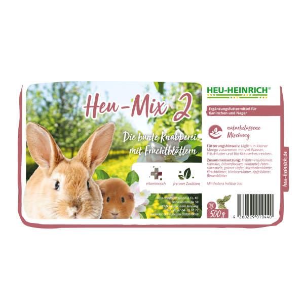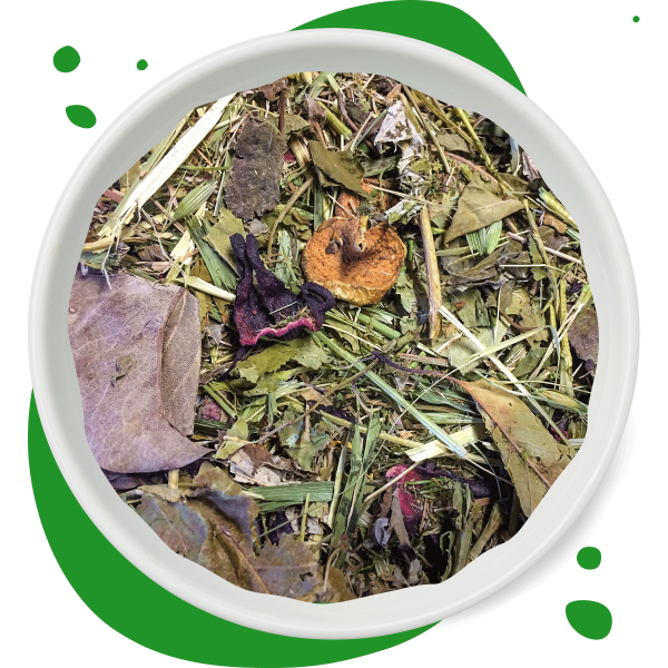 Bio-Kräuter-Heublumen*, Hibiskus, Erbsenflocken, Petersilienstiele, grüner Hafer, Himbeerblätter, Mirabellenblätter, Apfelblätter, Birnenblätter, Kirschblätter, Wildapfel