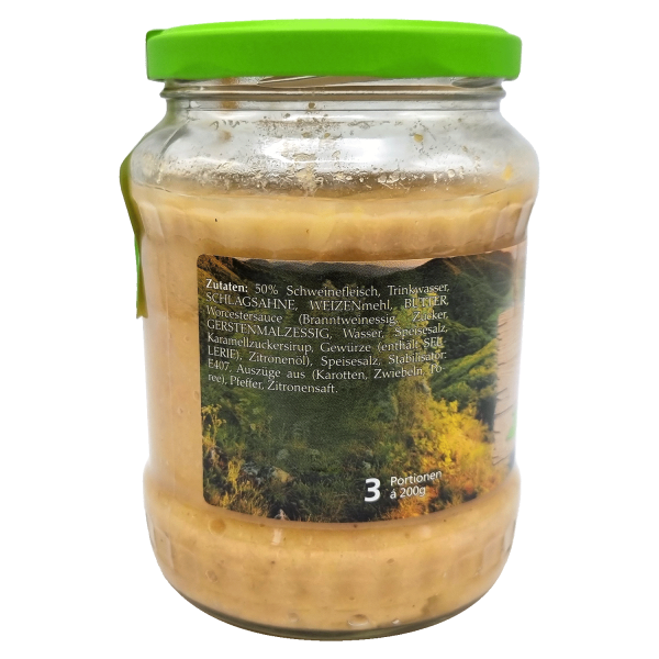 Zutaten: 50% Schweinefleisch, Trinkwasser, SCHLAGSAHNE, WEIZENmehl, BUTTER, Worcestersauce (Branntweinessig, Zucker, GERSTENMALZESSIG, Wasser, Speisesalz, Karamellzuckersirup, Gewürze (enthält SELLERIE), Zitronenöl), Speisesalz, Stabilisator: E407, Auszüge aus (Karotten, Zwiebeln, Poree), Pfeffer, Zitronensaft.