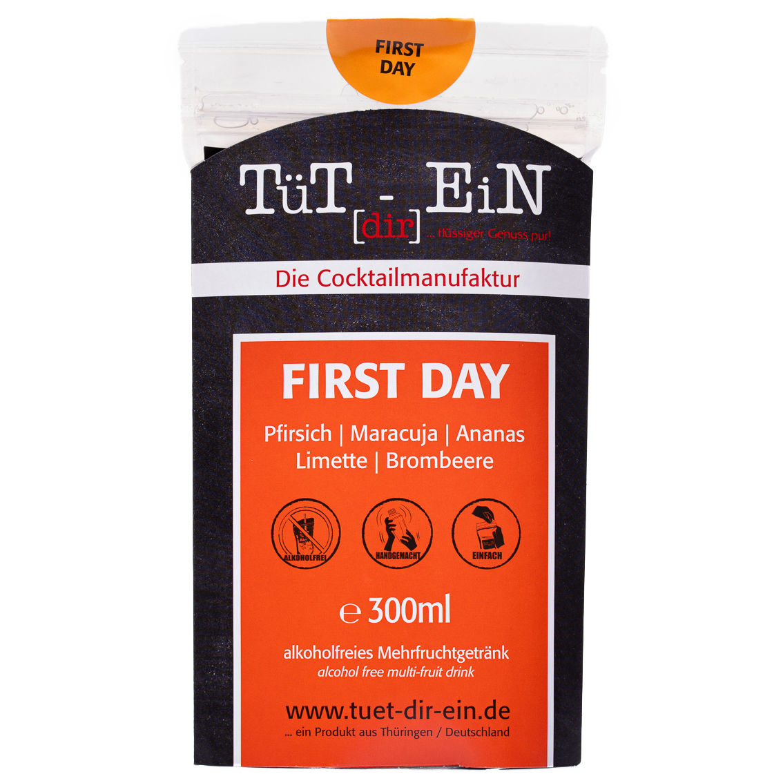 Der alkoholfreie First Day Cocktail von Tüt[dir]EiN ist eine Mischung aus Ananas-, Maracuja- und Pfirsichsaft, verfeinert mit einem Hauch Limette und der Süße von Brombeersirup.