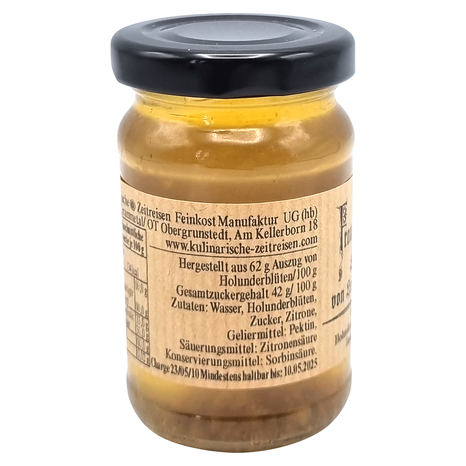 Wasser, Holunderblüten, Zucker, Zitrone Hergestellt aus 62 g Auszug von Holunderblüten /100 g Gesamtzuckergehalt 42 g/ 100 g Geliermittel: Pektin Säuerungsmittel: Zitronensäure