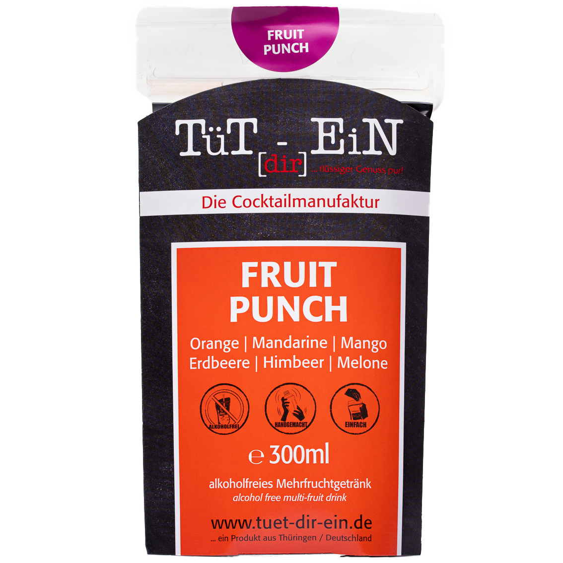 Der alkoholfreie Fruit Punch Cocktail von Tüt[dir]EiN ist ein besonders fruchtiges Erlebnis. Fruit Punch ist eine Mischung aus Orangen-, Mandarinen- und Erdbeersaft sowie Mango-, Himbeere- und Wassermelonensaft.