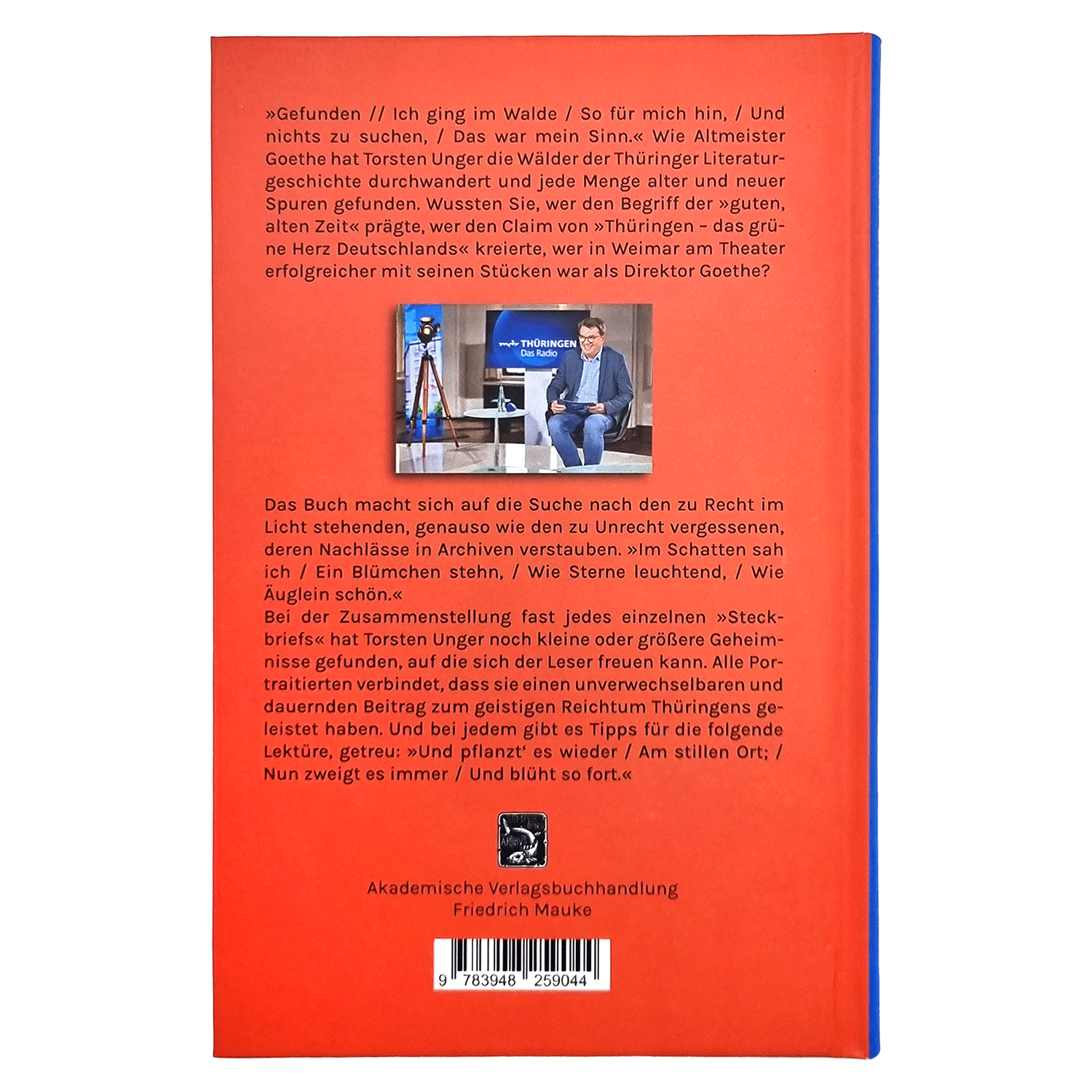 »Gefunden // Ich ging im Walde / So für mich hin, / Und nichts zu suchen, / Das war mein Sinn.« Wie Altmeister Goethe hat Torsten Unger die Wälder der Thüringer Literaturgeschichte durchwandert und jede Menge alter und neuer Spuren gefunden. Wussten Sie, wer den Begriff der »guten, alten Zeit« prägte, wer den Claim von »Thüringen – das grüne Herz Deutschlands« kreierte, wer in Weimar am Theater erfolgreicher mit seinen Stücken war als Direktor Goethe?