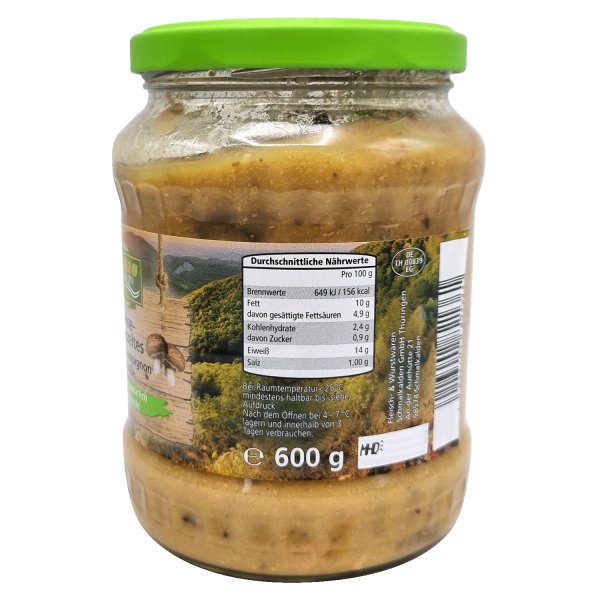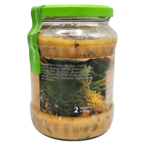 Zutaten: 50 % Schweinefleisch, SAHNEsoße (Trinkwasser, SAHNE, Stabilisator: E407, Auszüge aus (Karotten, Zwiebeln, Poree), WEIZENmehl, BUTTER), 6% Steinpilzchampignons, Zwiebel, Speisesalz, Rapsöl, Knoblauch, Pfeffer.