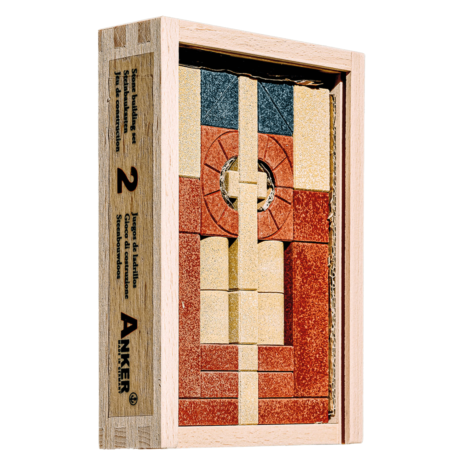 Der Grundkasten 2 bietet den idealen Einstieg in das System der Ankerbausteine. Er eignet sich bereits für die kleinen Baumeister und bietet Anregungen, die zum Nachbauen einladen. Im Holzkasten sind 30 Ankerbausteine in den klassischen Farben sandstein, ziegelrot und schieferblau enthalten.