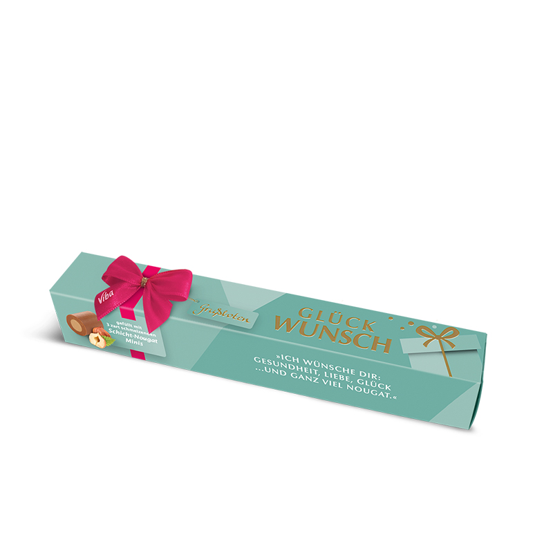 Dieser Grußbote sagt auf eine süße Art "Hertlichen Glückwunsch". Gefüllt mit 3 zart schmelzenden Schicht-Nougat Minis à 10 g und mit einer Echtschleife versehen eine Kleinigkeit, die das Geburtstagsgeschenk aufwertet. "Ich wünsche Dir einen Beutel voll Nougat, der nie leer wird ... und davon zwei."