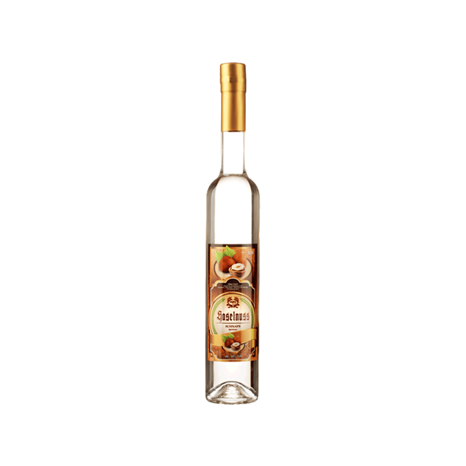 Edelbrand mit Haselnussgeschmack ein Klarer Schnaps ohne Farbe, im Geruch leicht Nussiges Aroma, Haselnuss Schnaps Fahner im Geschmack ausgeprägt nach Haselnüssen, Arttypisch nach Ethanol.