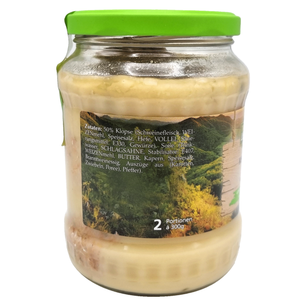 Zutaten: 50% Klopse (Schweinefleisch, WEIZENmehl, Speisesalz, Hefe, VOLLEI, Säuerungsmittel: E330, Gewürze), Soße (Trinkwasser, SCHLAGSAHNE, Stabilisator: E407, WEIZENmehl, BUTTER, Kapern, Speisesalz, Branntweinessig, Auszüge aus (Karotten, Zwiebeln, Poree), Pfeffer).