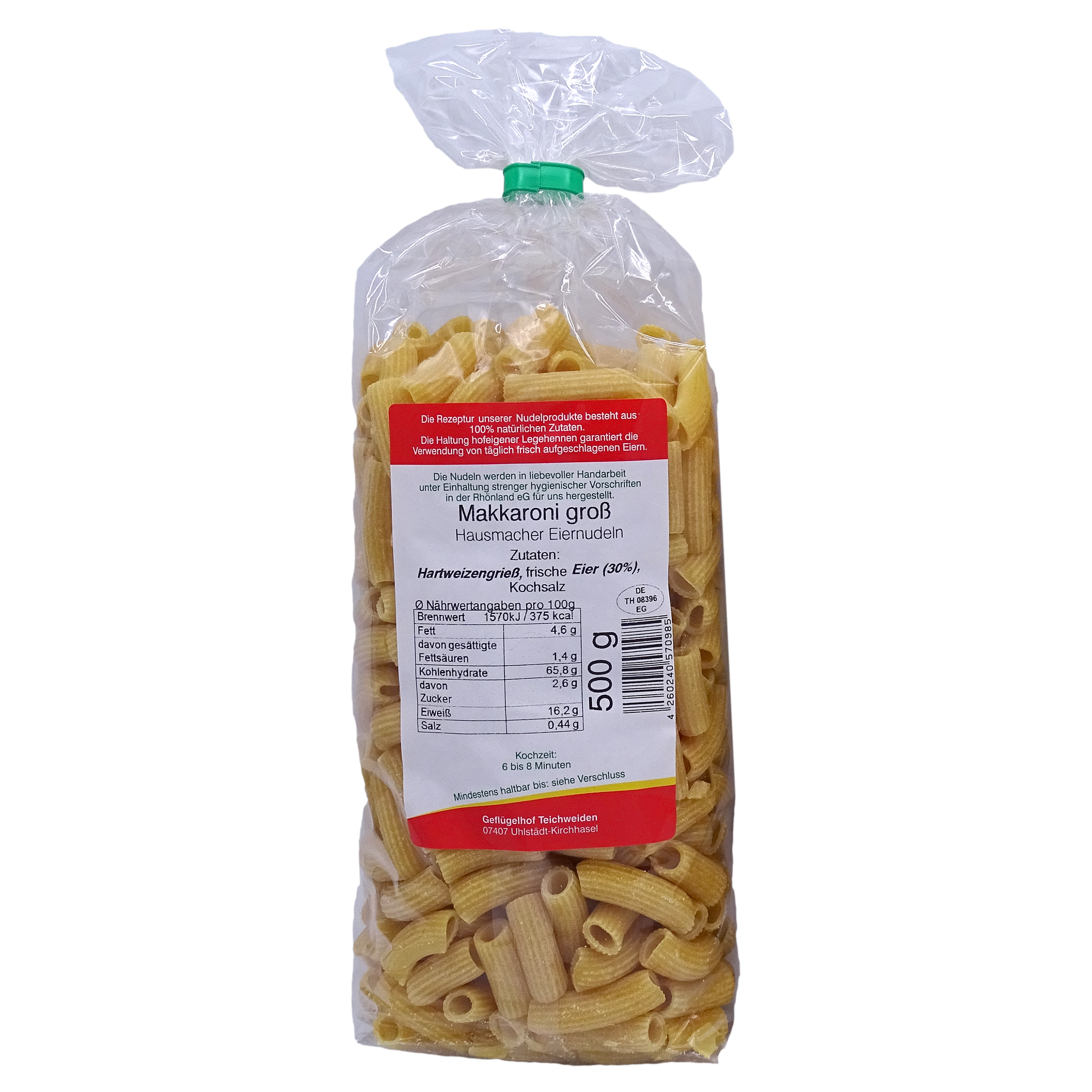 Makkaroni - Teichweidener hausgemachte Eiernudeln: die Rezeptur unserer Nudelprodukte besteht aus 100% natürlichen Zutaten. Die Haltung hofeigener Legehennen garantiert die Verwendung von täglich frisch aufgeschlagenen Eiern. Die Nudeln werden in liebevoller Handarbeit unter Einhaltung strenger hygienischer Vorschriften hergestellt. Kochzeit: 6 bis 8 Minuten.