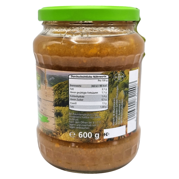 Genieße traditionelle Hausmannskost auf die schnelle Art: Unser herzhaft-zarter Mutzbraten mit einer feinen, perfekt abgeschmeckten Soße bietet ein echtes Geschmackserlebnis wie frisch zubereitet. Dieses Gericht wird nach bewährtem Rezept hergestellt und ist dank seiner schonenden Konservierung im Glas lange haltbar – perfekt für spontane Mahlzeiten oder Vorratshaltung. Einfach erwärmen und mit Beilagen deiner Wahl, wie Kartoffeln, Knödeln oder frischem Gemüse, kombinieren. Ein köstliches Gericht, das mit viel Liebe und hochwertigen Zutaten zubereitet wurde – für den vollen Geschmack traditioneller Küche in wenigen Minuten auf deinem Teller!Inhalt: 600g