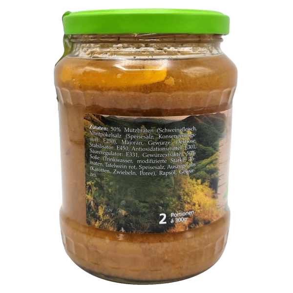 Zutaten: 50% Mutzbraten (Schweinefleisch, Nitritpökelsalz (Speisesalz, Konservierungsstoff: E250), Majoran, Gewürze, Dextrose, Stabilisator: E450, Antioxidationsmittel: E301, Säureregulator: E331, Gewürzextrakte), 50% Soße (Trinkwasser, modifizierte Stärke, Tomaten, Tafelwein rot, Speisesalz, Auszüge aus (Karotten, Zwiebeln, Poree), Rapsöl, Gewürze).