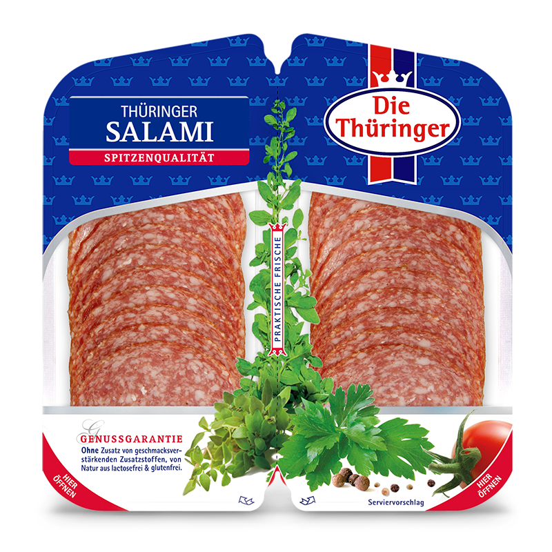 Traditionelle Rezepte, bewährte Herstellungsverfahren – all unsere Erfahrung fließt in unser vielfältiges Aufschnittsortiment ein. Es beweist, dass Wurstwaren mit Thüringer Qualität etwas ganz Besonderes sind. Unsere neue Verpackungsidee, der clevere Duo-Pack, garantiert durch zwei einzeln versiegelte Kammern besonders lange und praktische Frische. Und das schmeckt man!