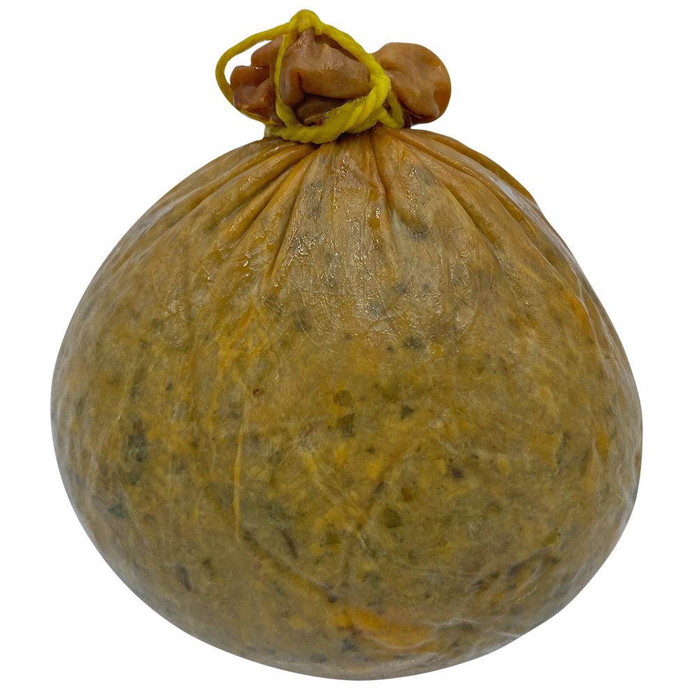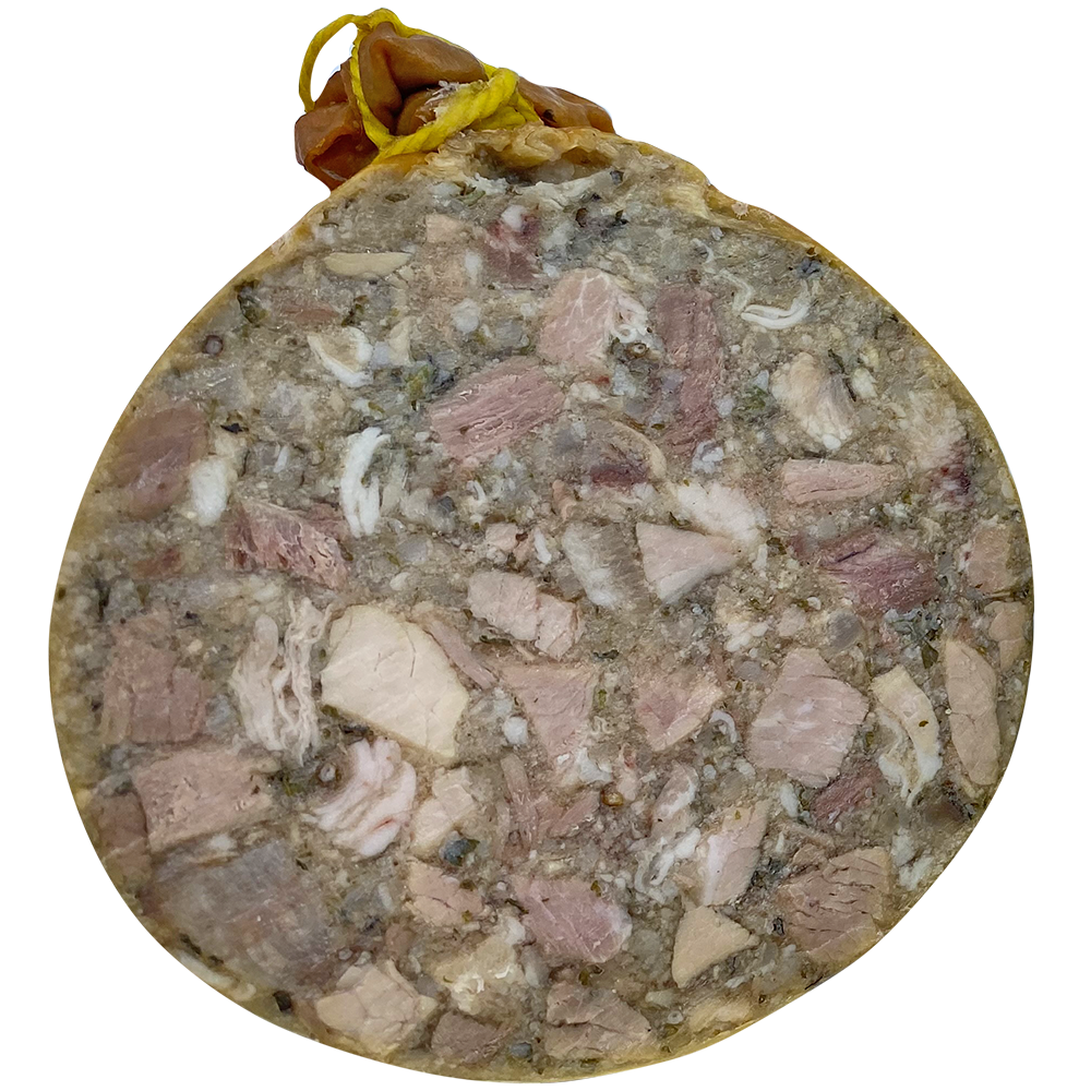 Sülze mit magerer Schweinekopffleischeinlage in der Schweineblase. Eine leichte Kümmelnote rundet den Geschmack ab.