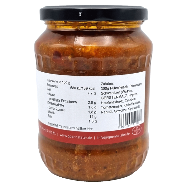 300g Putenfleisch, Trinkwasser, Schwarzbier (Wasser, GERSTENMALZ, Hopfen, Hopfenextrakt), Zwiebeln, Tomatenmark, Kartoffelstärke, Rapsöl, Gewürze, Speisesalz