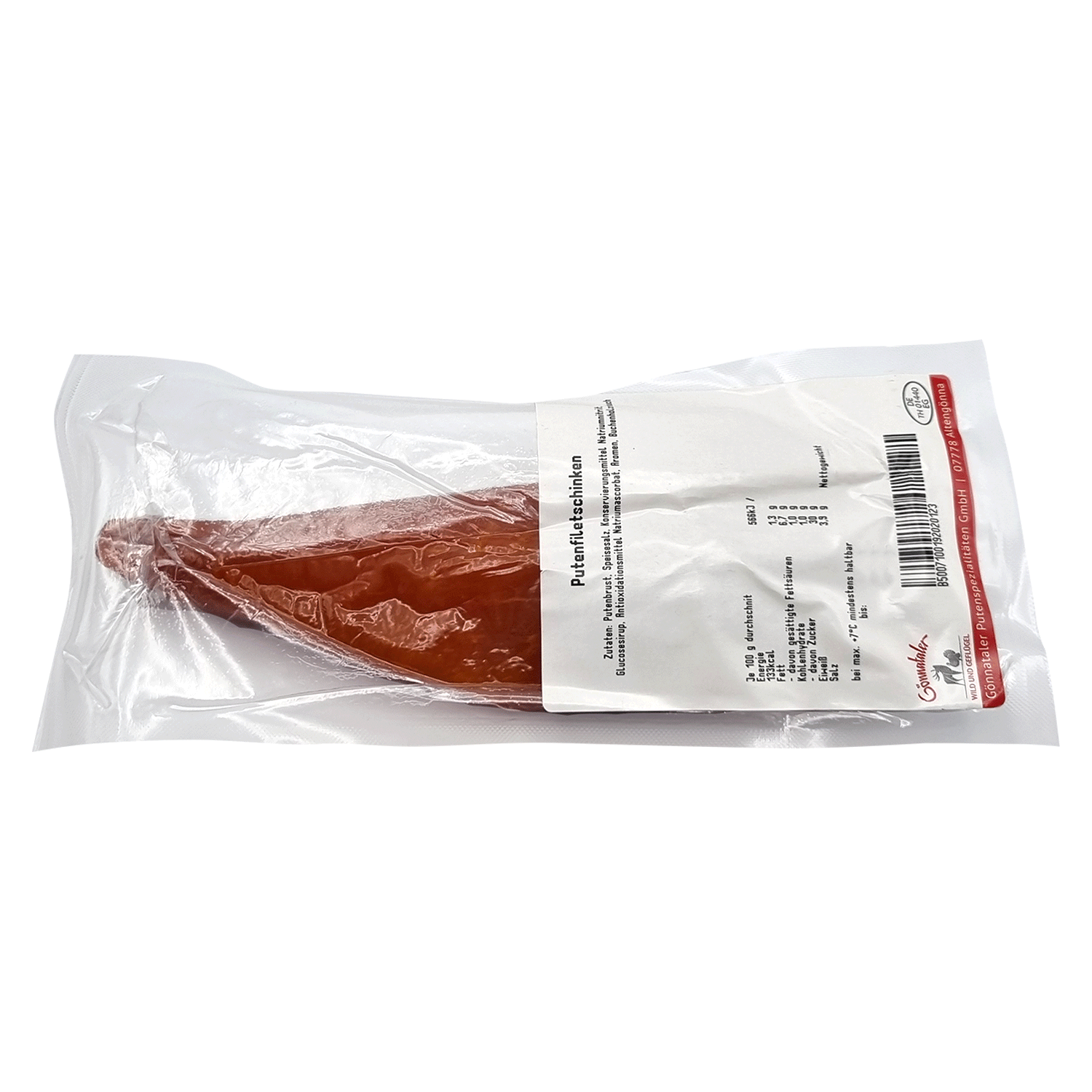 Putenbrust, Speisesalz, Konservierungsmittel Natriumnitrit, Glucosesirup, Antioxidationsmittel Natriumascorbat, Aromen, Buchenholzrauch