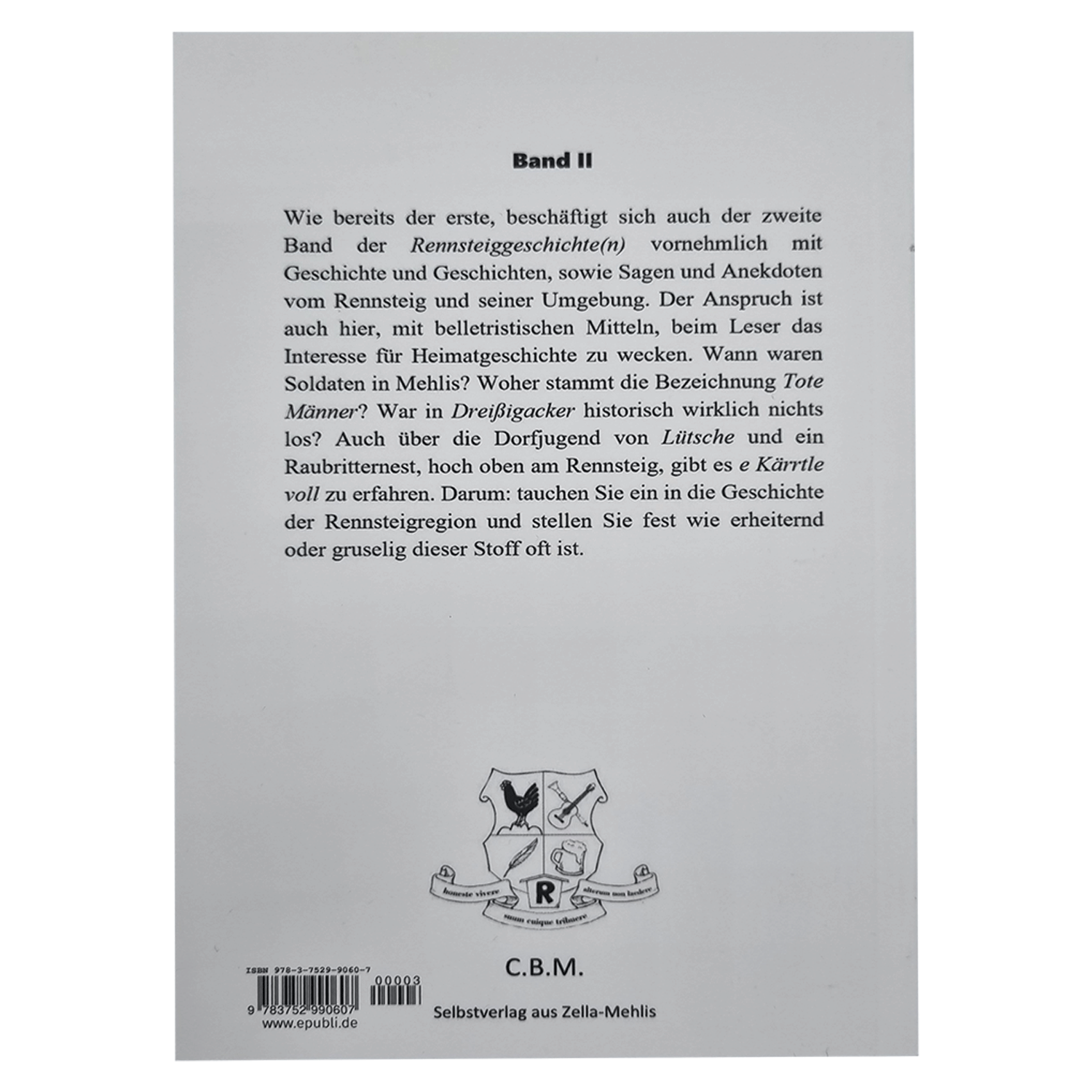 Wie bereits der erste, beschäftigt sich auch der zweite Band der Rennsteiggeschichte(n) vornehmlich mit Geschichte und Geschichten, sowie Sagen und Anekdoten vom Rennsteig und seiner Umgebung. Der Anspruch ist auch hier, mit belletristischen Mitteln, beim Leser das Interesse für Heimatgeschichte zu wecken. Wann waren Soldaten in Mehlis? Woher stammt die Bezeichnung Tote Männer? War in Dreißigacker historisch wirklich nichts los? Auch über die Dorfjugend von Lütsche und ein Raubritternest, hoch oben am Rennsteig, gibt es e Kärrtle voll zu erfahren. Darum: tauchen Sie ein in die Geschichte der Rennsteigregion und stellen Sie fest wie erheiternd oder gruselig dieser Stoff oft ist.