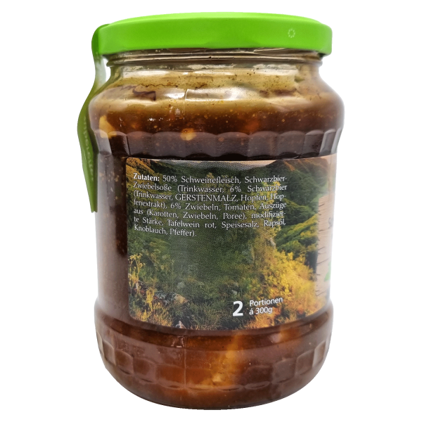Zutaten: 50% Schweinefleisch, Schwarzbier-Zwiebelsoße (Trinkwasser, 6% Schwarzbier (Trinkwasser, GERSTENMALZ, Hopfen, Hopfenextrakt), 6% Zwiebeln, Tomaten, Auszüge aus (Karotten, Zwiebeln, Poree), modifizierte Stärke, Tafelwein rot, Speisesalz, Rapsöl, Knoblauch, Pfeffer).