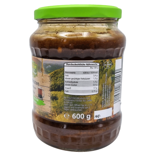 Unser Schweinebraten mit Schwarzbier Zwiebelsoße ist ein echtes Fest für die Sinne! Saftiger Braten, liebevoll gewürzt und verfeinert mit einer herzhaften Zwiebelnote, wird in einer kräftigen Schwarzbiersoße serviert, die durch ihr vollmundiges Aroma begeistert. Dieses Gericht im Glas ist vollkonserviert und bietet Ihnen traditionellen Genuss mit moderner Bequemlichkeit – ideal für spontane Mahlzeiten oder als Vorrat in der Speisekammer. Einfach erwärmen und mit Beilagen wie Knödeln, Kartoffelpüree oder Gemüse servieren. Hol dir den Geschmack feinster Küche ohne Aufwand direkt nach Hause!