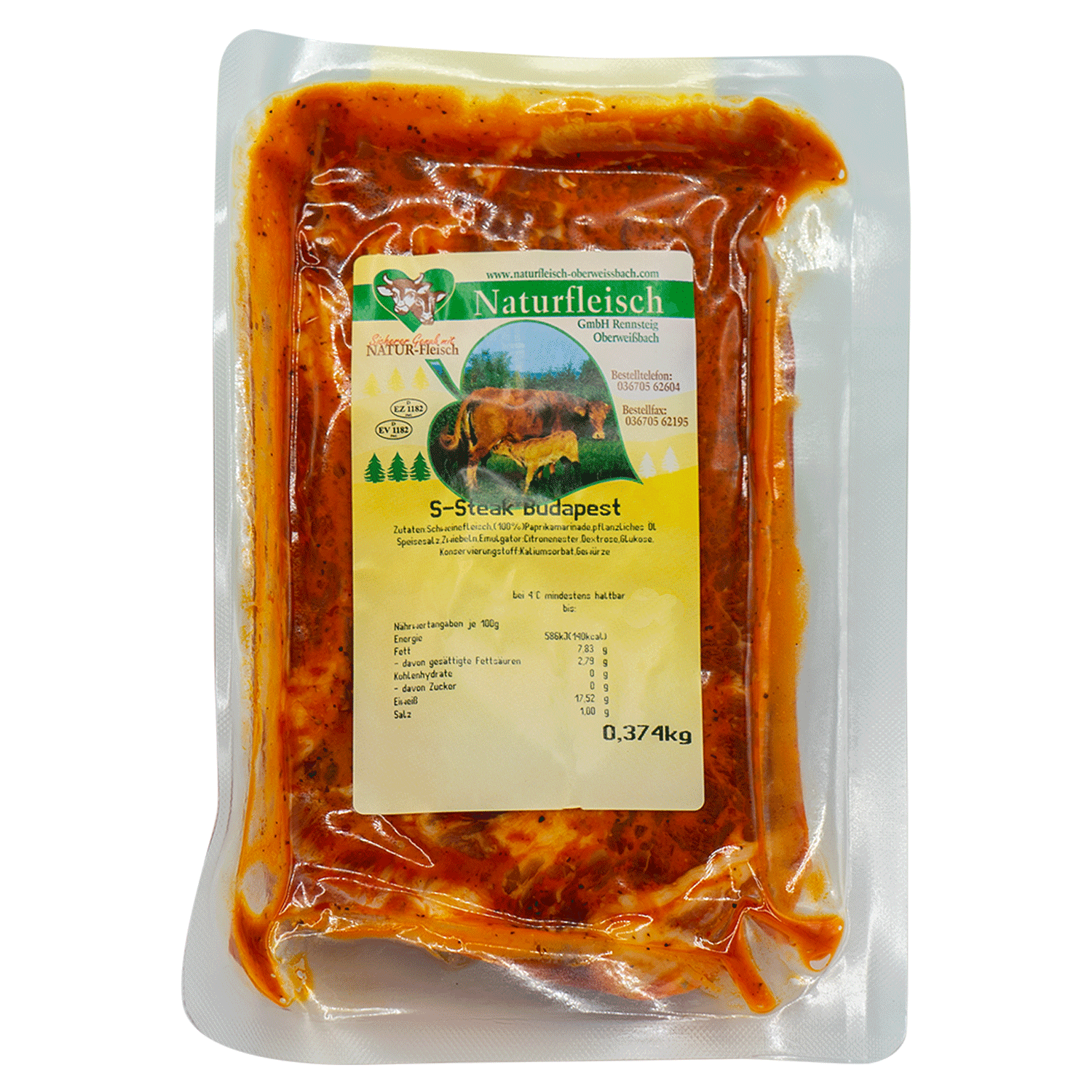 Schweinefleisch (100%), Paprikamarinade, planzliches Öl, Speisesalz, Zwiebeln, Emulgator: Citronenester, Dextrose, Glukose, Konservierungsstoff: Kaliumsorbat, Gewürze