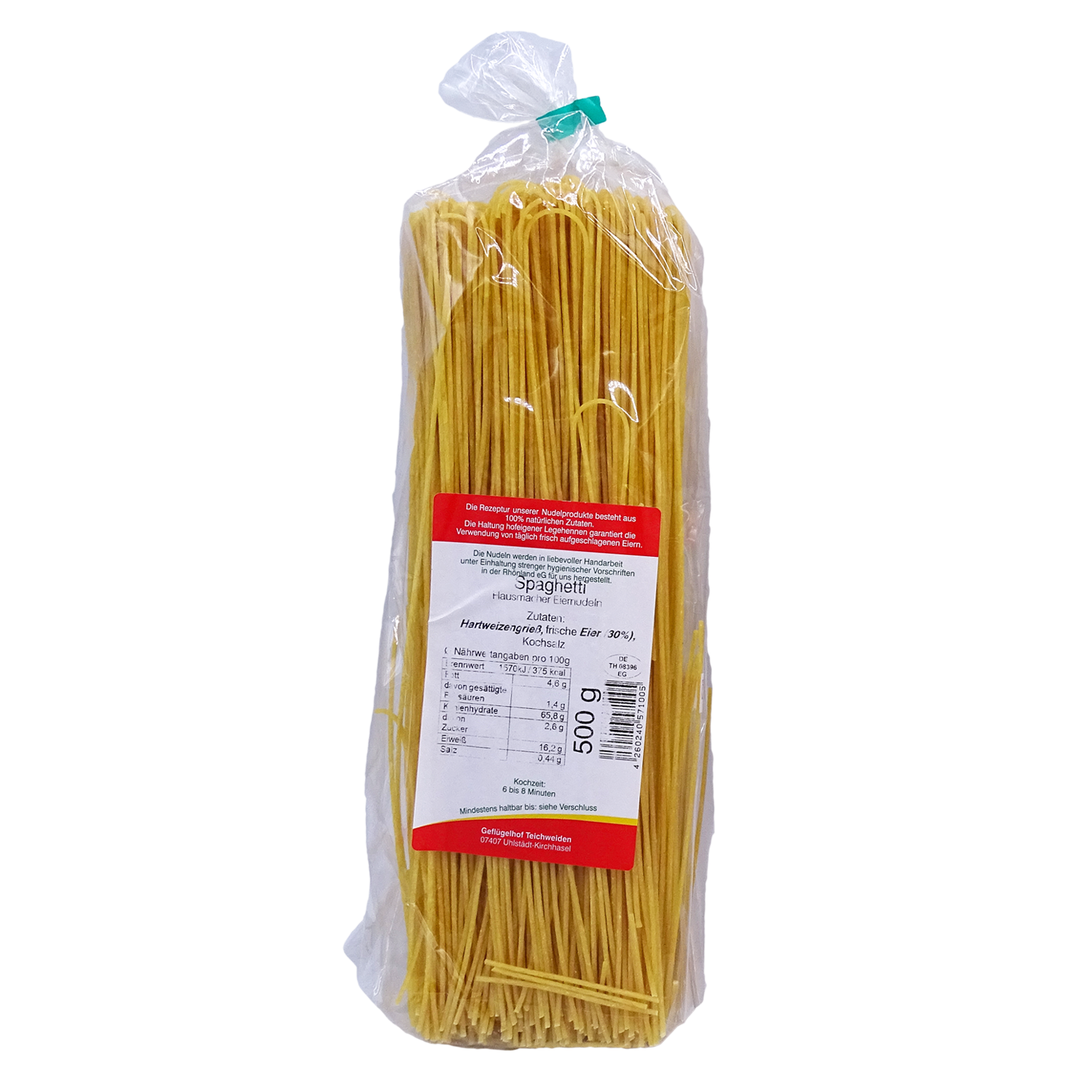 Spaghetti- Teichweidener hausgemachte Eiernudeln: die Rezeptur unserer Nudelprodukte besteht aus 100% natürlichen Zutaten. Die Haltung hofeigener Legehennen garantiert die Verwendung von täglich frisch aufgeschlagenen Eiern. Die Nudeln werden in liebevoller Handarbeit unter Einhaltung strenger hygienischer Vorschriften hergestellt. Kochzeit: 6 bis 8 Minuten.
