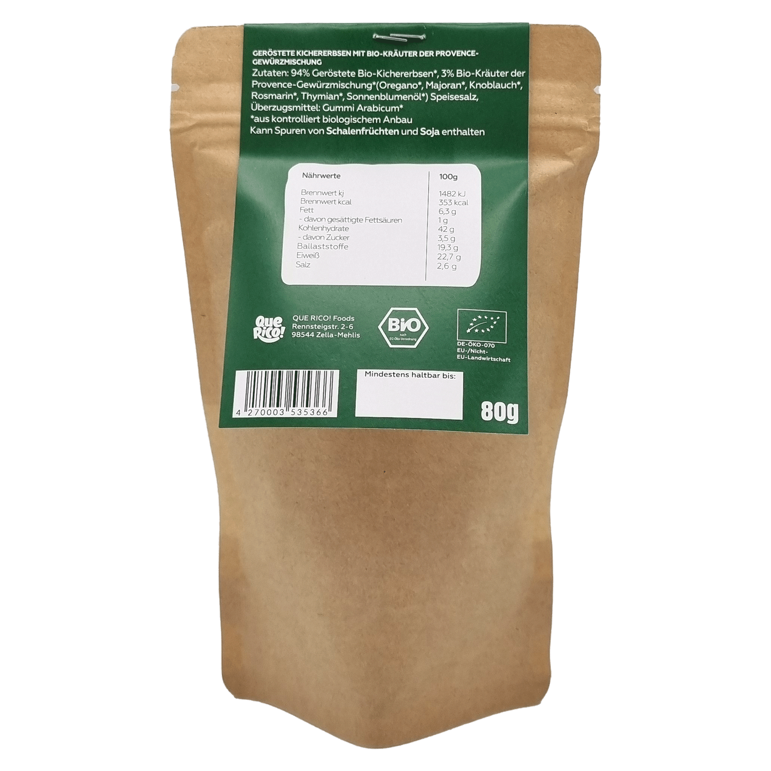 94% Geröstete Bio-Kichererbsen*, 3% Bio-Kräuter der Provence-Gewürzmischung* (Oregano*, Majoran*, Knoblauch*, Rosmarin*, Thymian*, Sonnenblumenöl*), Speisesalz, Rohrzucker* Überzugsmittel: Gummi Arabicum*