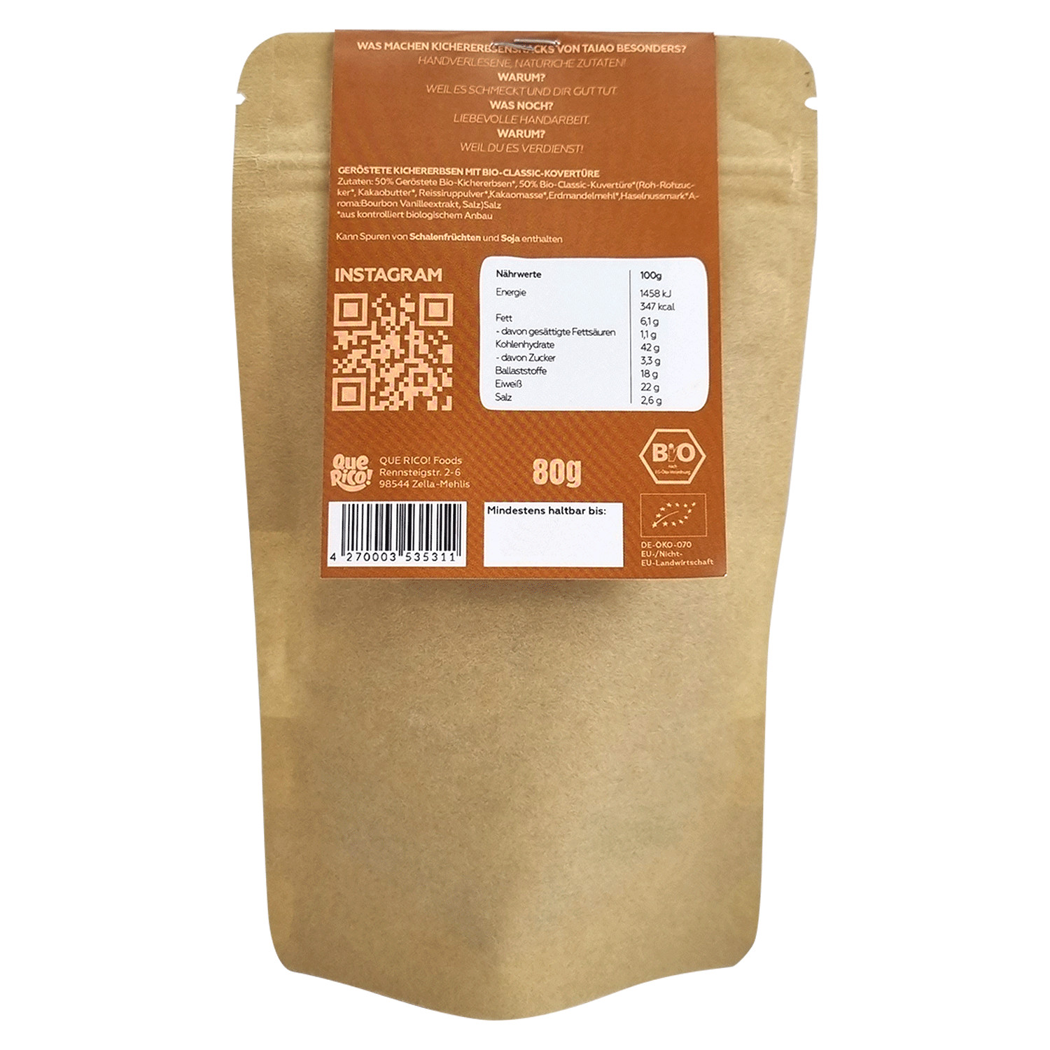 50% geröstete Bio-Kichererbsen*, 50% Bio-Classic-Kuvertüre* (Roh-Rohrzucker*, Kakaobutter*, Reissiruppulver*, Kakaomasse*, Erdmandelmehl*, Haselnussmark*, Aroma: Bourbon Vanilleextrakt, Speisesalz), Salz