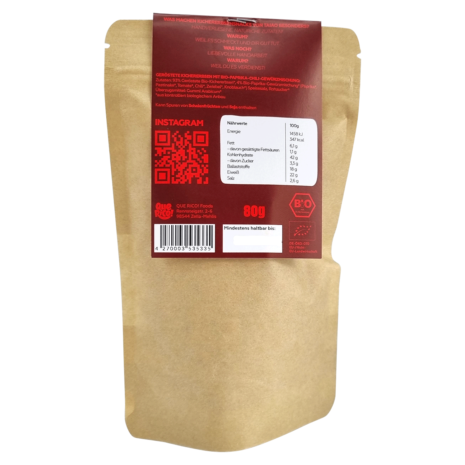 93% Geröstete Bio-Kichererbsen*, 4% Bio-Paprika-Gewürzmischung* (Paprika*, Pastinake*, Tomate*, Chili*, Zwiebel*, Knoblauch*), Speisesalz, Rohrzucker* Überzugsmittel: Gummi Arabicum*