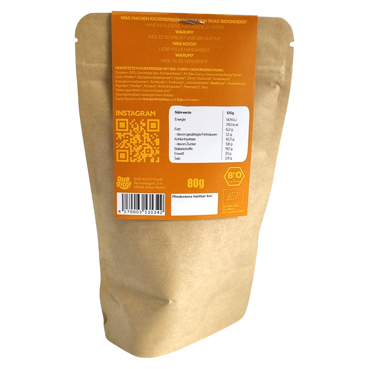 93% Geröstete Bio-Kichererbsen*, 4% Bio-Curry-Gewürzmischung* (Anis*, Chili-pfeffer*, Bockshornkleesamen*, Ingwer*, Zimt*, Kümmel*, Knoblauch*, Kreuzkümmelsamen*, Koriander*, Kurkuma*, Liebstöckelblatt*, Senfsaat*, Muskatnuss*, Paprika*, Pfeffer*, Piment*, Rohrzucker*, Meersalz*), Salz, Überzugsmittel: Gummi Arabicum*