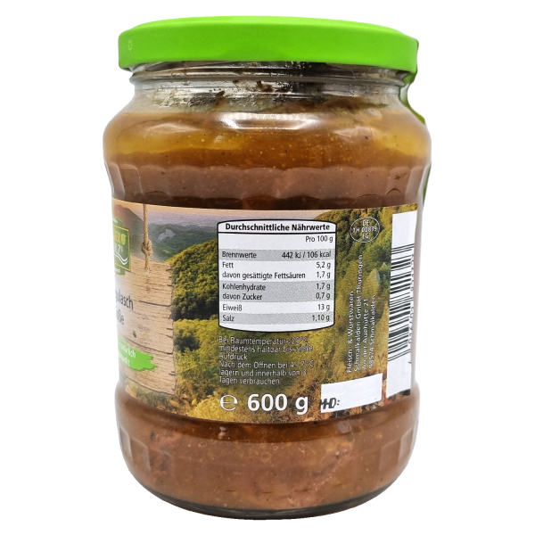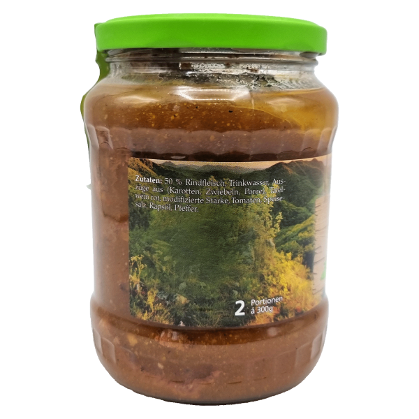 Unser Rindergulasch im Glas bringt dir den vollen Geschmack eines herzhaften Hausgerichts – immer bereit, wenn du es brauchst! Zartes Rindfleisch, schonend geschmort und in einer kräftigen, würzigen Soße eingelegt, macht dieses Gulasch zu einem echten Klassiker. Dank der Vollkonservierung ist unser Gulasch besonders lange haltbar, ohne dass du auf den hausgemachten Geschmack verzichten musst. Egal, ob für ein schnelles Essen nach einem langen Tag oder für den besonderen Anlass – einfach erhitzen, mit Beilagen wie Kartoffeln, Reis oder Nudeln servieren, und im Handumdrehen genießt du ein vollwertiges, herzhaftes Gericht. Lang haltbar, voll im Geschmack und schnell zubereitet– das ideale Gulasch für jede Gelegenheit!