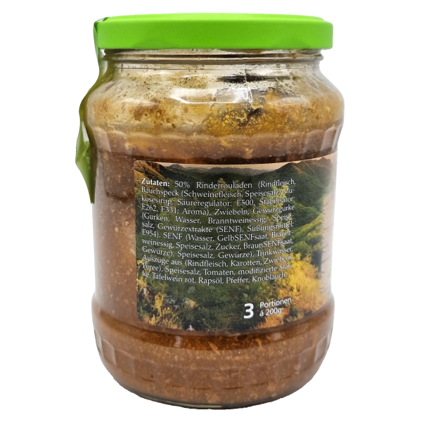 Zutaten: 50% Rinderrouladen (Rindfleisch, Bauchspeck (Schweinefleisch, Speisesalz, Glukosesirup, Säureregulator: E500, Stabilisator: E262, E331; Aroma), Zwiebeln, Gewürzgurke (Gurken, Wasser, Branntweinessig, Speisesalz, Gewürzextrakte (SENF), Süßungsmittel: E954), SENF (Wasser, GelbSENFsaat, Branntweinessig, Speisesalz, Zucker, BraunSENFsaat, Gewürze), Speisesalz, Gewürze), Trinkwasser, Auszüge aus (Rindfleisch, Karotten, Zwiebeln, Poree), Speisesalz, Tomaten, modifizierte Stärke, Tafelwein rot, Rapsöl, Pfeffer, Knoblauch.
