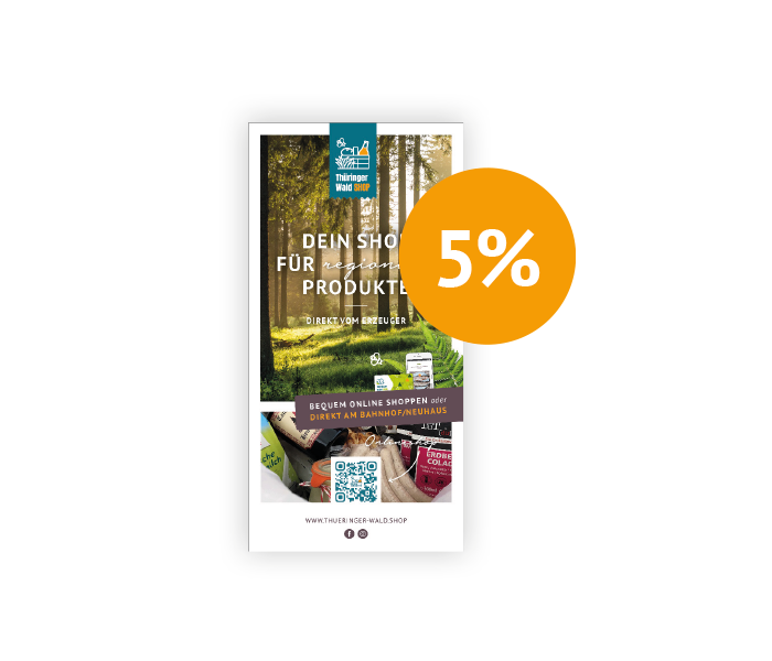 Kaufen Sie da, wo Produkte ihren Ursprung haben – für mehr Vielfalt und Qualität, die Sie spüren und genießen können. Der Thüringer Wald Shop bietet eine breite Produktpalette an regionalen Erzeugnissen – von Fleisch- und Wurstwaren, Spirituosen und Kosmetik bis hin zu Spielwaren und Handwerkskunst. Bei Vorlage Ihrer Thüringer Wald Card erhalten Sie 10% Rabatt auf Ihren Einkauf in unserem Shop vor Ort, bei Vorlage unseres aktuellen Flyers 5%. (Rabatte nicht kombinierbar)