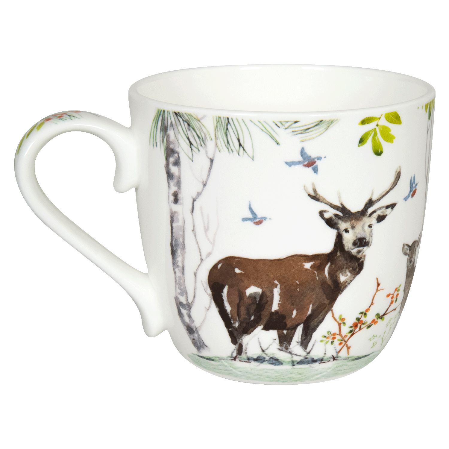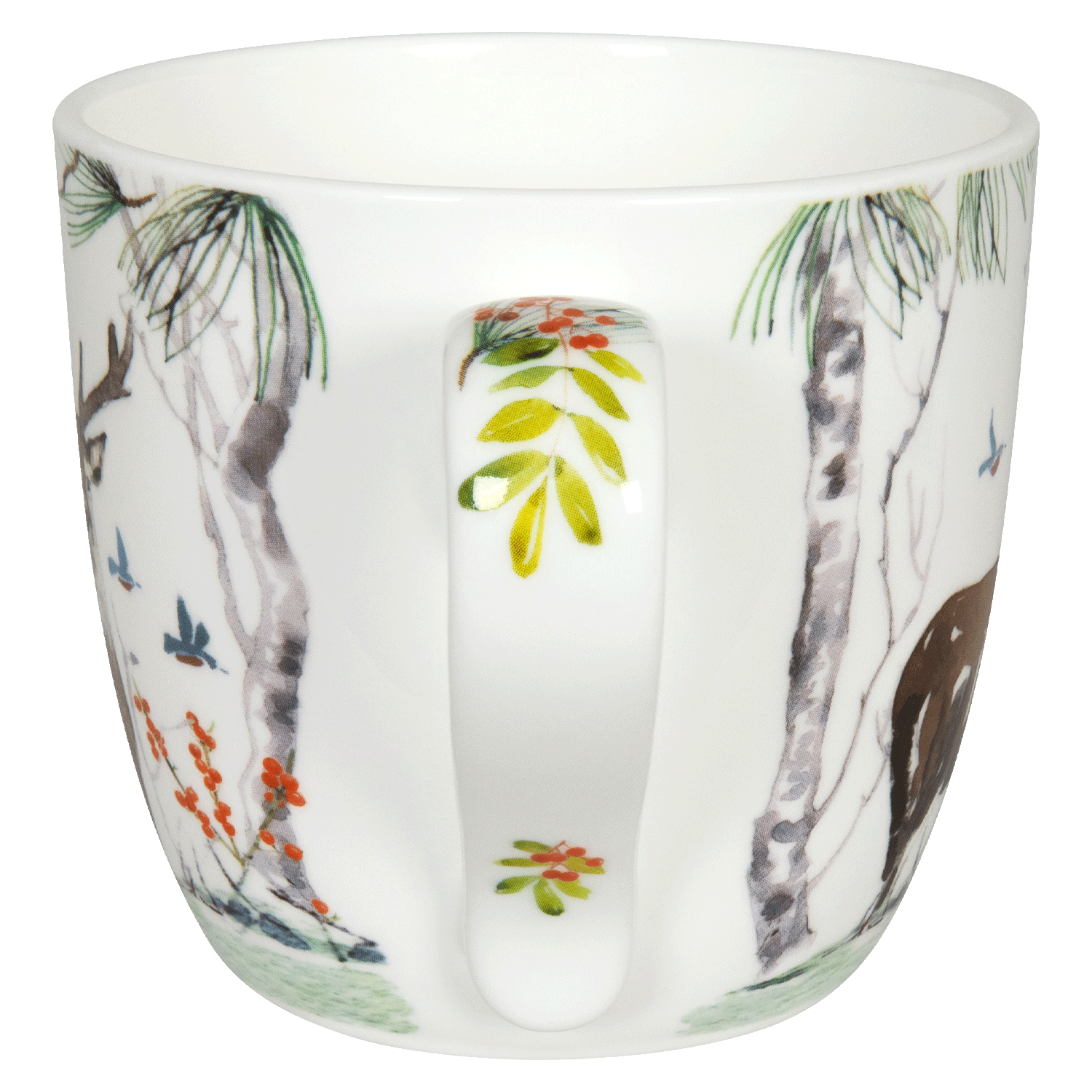 Wenn die Tage kürzer werden und es draußen kalt ist, sitzt man am liebsten beisammen und genießt einen heißen Tee, Kaffee oder Kakao aus diesem Becher. In einer Szenerie aus Bäumen, Beeren und Sträuchern lässt uns dieser Becher an die Tiere im Wald denken, an die Vögel, die nicht in den Süden ziehen und das Wild, das versucht unter der dichten Schneedecke Nahrung zu finden. Die Tasse besteht aus hochwertigem Bone China Porzellan und besticht neben seinem brillanten Hauptmotiv auch durch feine Verzierungen als Innenbild und auf dem Henkel.