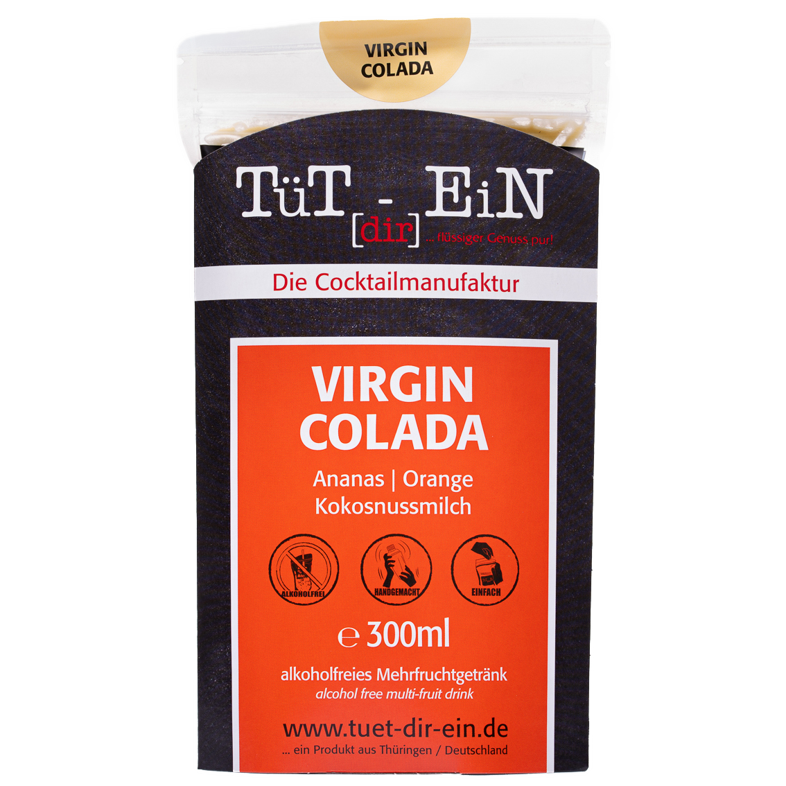 Die Cocktails von Tüt[dir]EiN sind alle handgemacht. Verwendet werden ausschließlich qualitativ hochwertige und frische Zutaten namhafter Marken, von 100% Säften, über Sirup und Spirituosen der Premiumkategorie. Gemixt wird nach eigener Rezeptur, mit konstant bleibender Qualität. Qualität die der Kunde schmeckt!