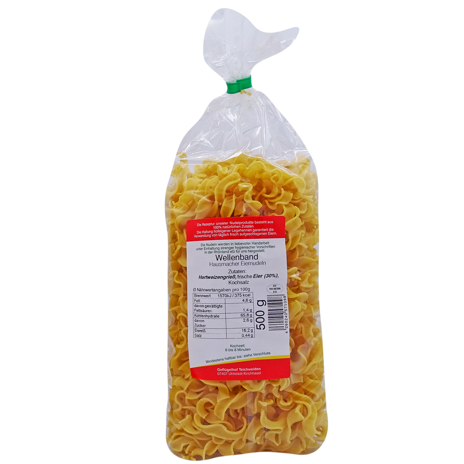 Wellenbandnudeln - Teichweidener hausgemachte Eiernudeln: die Rezeptur unserer Nudelprodukte besteht aus 100% natürlichen Zutaten. Die Haltung hofeigener Legehennen garantiert die Verwendung von täglich frisch aufgeschlagenen Eiern. Die Nudeln werden in liebevoller Handarbeit unter Einhaltung strenger hygienischer Vorschriften hergestellt. Kochzeit: 6 bis 8 Minuten.
